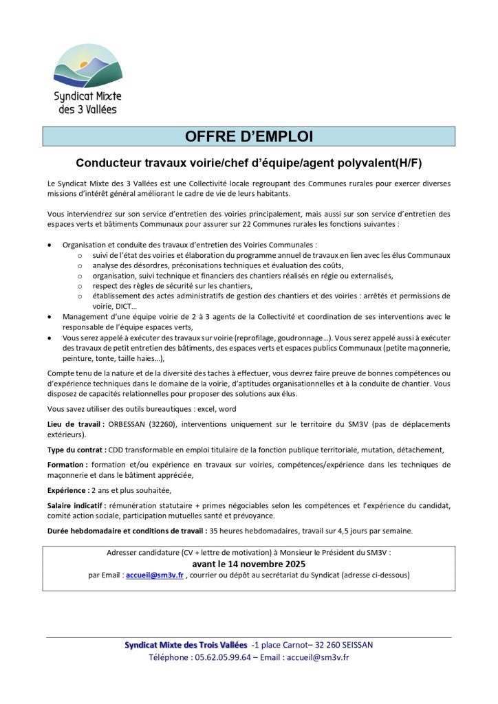Offre d’emploi au Syndicat Mixte des 3 Vallées